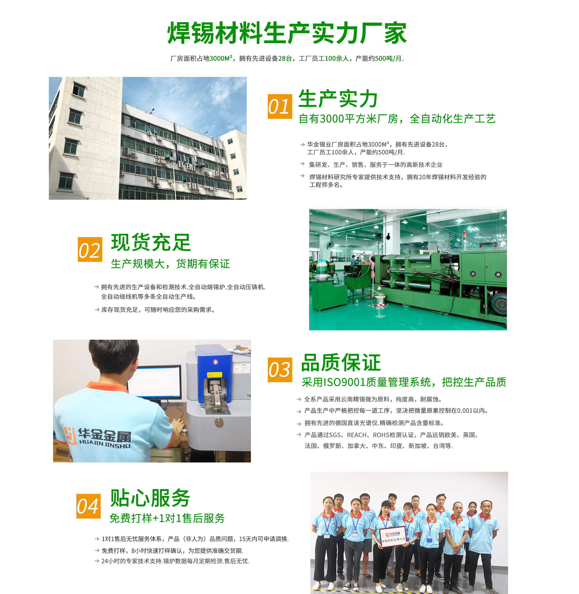 華金錫業(yè)有限公司一家資深的專業(yè)焊錫制品生產(chǎn)廠家,多年專注焊錫制品生產(chǎn)加工。產(chǎn)品有無(wú)鉛錫絲.無(wú)鉛錫條.錫板.錫膏.錫珠等.公司憑借多年的經(jīng)驗(yàn)和不斷的科技創(chuàng)新.生產(chǎn)的產(chǎn)品各項(xiàng)技術(shù)性能均達(dá)到國(guó)家標(biāo)準(zhǔn).歐盟標(biāo)準(zhǔn)。并獲得眾多使用廠家的肯定.為適應(yīng)環(huán)保要求.本公司2003年巨資投入生產(chǎn)無(wú)鉛焊錫,多年來(lái)連續(xù)通過(guò)SGS環(huán)保認(rèn)證.產(chǎn)品規(guī)格齊全,使用性能極佳??蛻羧后w遍布全國(guó)各地及國(guó)外用戶。華金錫業(yè)焊錫制品是選用一線品牌作為原材料,采用選進(jìn)的配方,精工制作各種規(guī)格不同的型號(hào),再采用全自動(dòng)流水線作業(yè)擠拉成各種符合要求的焊錫絲和焊錫條。華金牌焊錫制品以其一流的品質(zhì),真誠(chéng)的服務(wù),產(chǎn)品銷往全國(guó)各地,深受廣大用戶的高度贊揚(yáng)。